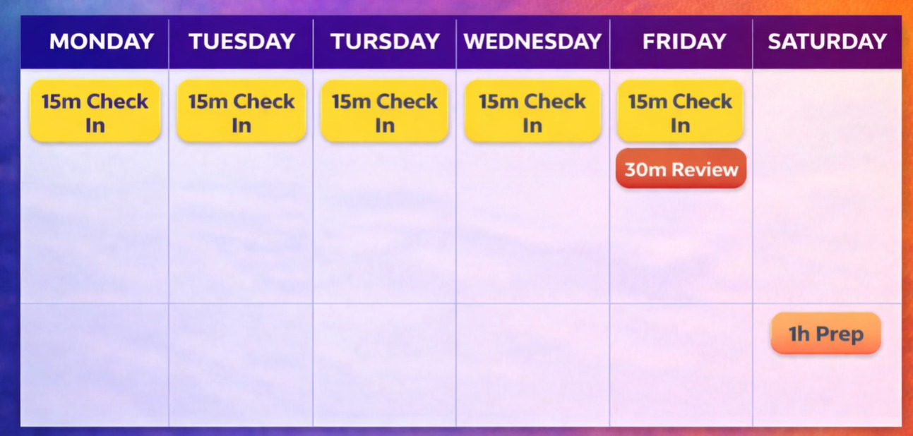 Total time commitment: roughly 1 hour of prep per week plus 15 minutes of journaling per day.